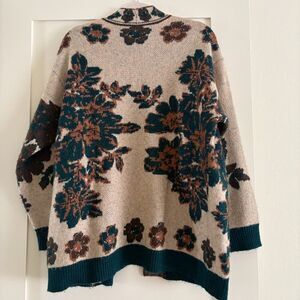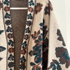 Zara oversized knit cardigan in a beige floral jacquard pattern. Button-front style with a deep V-neckline and relaxed, slouchy fit. Cozy.