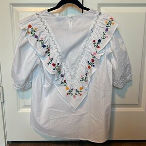 White cotton short sleeve top with v-shaped ruffle along the front and back. The ruffle is finished with deshilado detailing. Deshilado, literally translated, means "to pull out threads." The artisans pull the cotton threads from the fabric and then use those pulled threads to create an intricate, lace-like design. Hand-pulled crochet finishes neckline and sleeves.