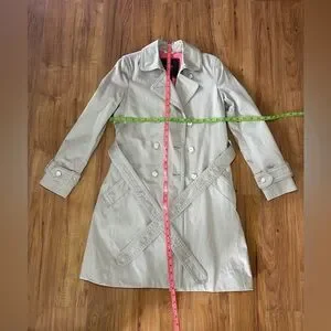 (#122)-Stylish double-breasted trench coat by Coach. Features classic design and button details. Ideal for versatile wear.