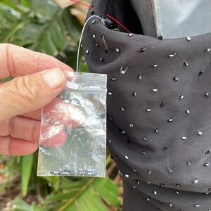 We start with spaghetti straps and it is biased cut hence the slip dress moniker. There is a cow draped collar that has been beaded with a jet glass bead. That cow drapes around the back and ties. Fully lined in an excellent condition extra beads attached. This is vintage, but it is dead stock.