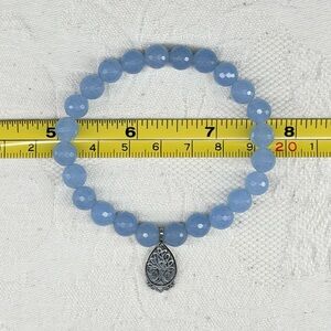 Vintage Satya Jewelry blue chalcedony stretch bracelet with sterling silver Tree of Life charm.