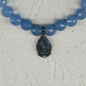 Gorgeous blue chalcedony and lustrous sterling silver charm. In some of the pictures the chalcedony is photographing darker than it is in person. In person it is a bit paler, moderately cloudy, medium cornflower blue, like the picture with the measuring tape.