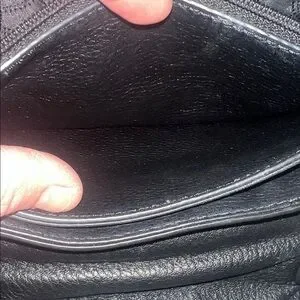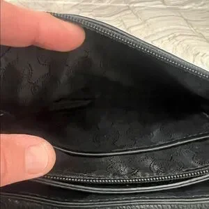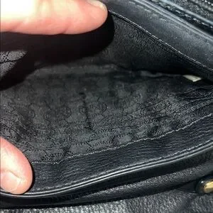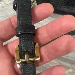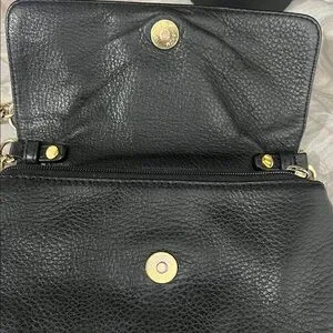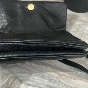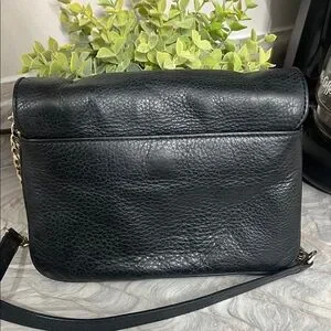 Sophisticated black leather crossbody. Features gold-tone logo detail. Perfect for versatile styling.