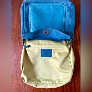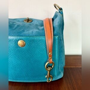 Hobo Vibrant teal nubuc exterior with iconic top turnlock closure. Antique brass toned hardware. Smooth leather constrasting teal exterior slip pocket w/ Coach embossed Chelsea hardware. Unique layered leather should strap in brown/british tan; completely detachable w/ chunky dog leash clips on either side. Matching nubuc hangtag. Lime green satin interior.
