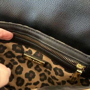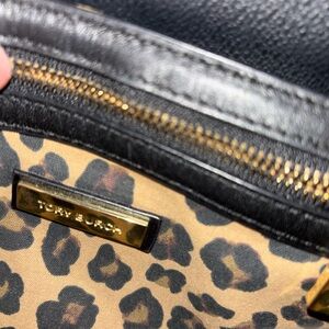 Elevate your style with this chic Tory Burch leopard print crossbody bag. Featuring a sleek black flap and adjustable strap, it's perfect for any occasion. 8x6.5x3 22 inch strap