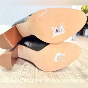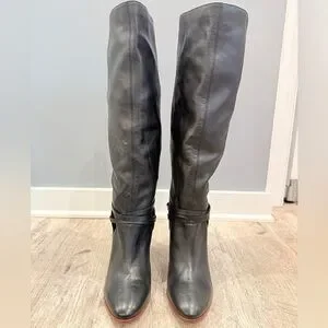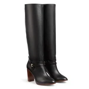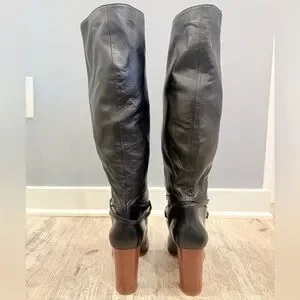 The Shelby knee-high boots are crafted in Italy from black nappa leather. They have an almond-shaped toe, a slouchy fit, gold tone eyelet and wrap detail and a 90mm wooden stacked heel. Heel height 9cm. Leather. New, some marks on sole from storage, partial protective sticker still remains. Pls inspect all photos as it’s part of the product description. No box/bag.
