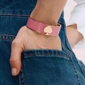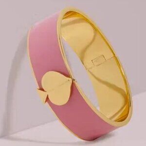 Elegant bracelet with pink enamel and gold accents. Features signature Kate Spade design. This is a great size bracelet. Large enough to wear alone to make a statement or small enough to be stacked.