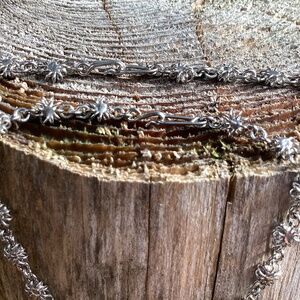 This is a really beautiful and delicate silver intricate link designed necklace and bracelet set. I tried to take as many photos as possible to capture the unique and delicate design. It’s really quite beautiful. Good link design hasp closure. Metal purity unknown as there are no marks visible I could find. Good strong craftsmanship with a great unique look. The necklace is measuring from end to end just shy of 16 inches and the bracelet is measuring at 7.25 inches.