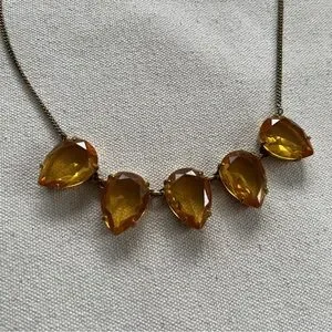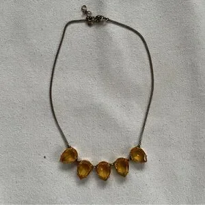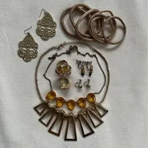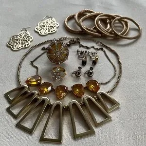 In good used condition. A tiny bit of tarnishing on the drop earrings and yellow stone necklace, but hardly noticeable.