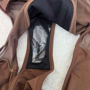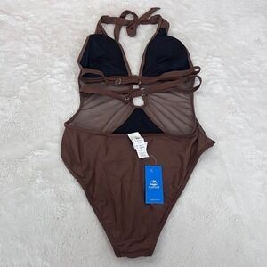 Stylish brown one piece with mesh cutouts. Halter neck design. Perfect for beach or pool.