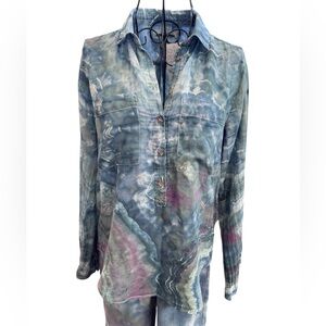 Custom ice dyed tissue weight woven blouse. One of a kind. Genuine shell buttons, pull-over design. 100% cotton,, no stretch.