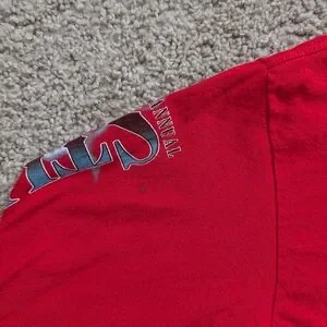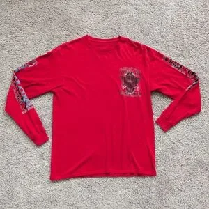 This red long sleeve shirt features bold graphics commemorating the 77th Annual Sturgis Bike Week in 2017. Designed with a classic long sleeve silhouette, it offers a comfortable, relaxed fit suitable for everyday wear. The striking front and sleeve graphics add visual impact while maintaining an easy-to-style look. Ideal for casual outfits or layered wear, it works well across multiple seasons.