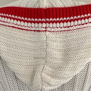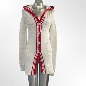 Elegant white cardigan with striking red accents. Features a cozy hood and button-up front. Ideal for layering.