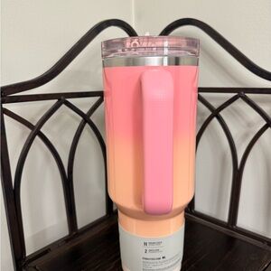 Stylish Stanley tumbler with gradient design. Features a durable handle and clear lid.