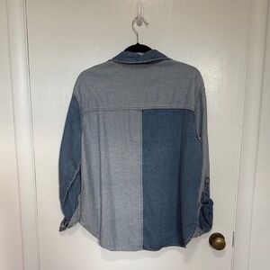Stylish denim button-up top. Features a mix of light and dark blue panels. Long sleeves with button cuffs. Perfect for casual wear.