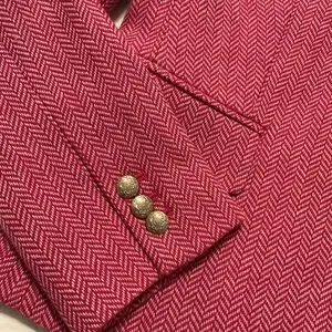 Stylish, fitted blazer in an updated pink herringbone pattern. The timeless style features buttoned cuffs that can be flipped up to reveal the contrasting blue and white pinstripe lining.