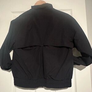 Sleek black bomber jacket by The North Face. Features a vibrant green camo lining. Ideal for casual wear. Women’s size medium.