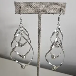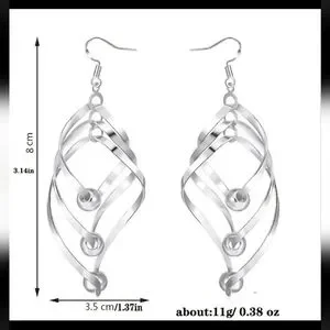 Twisted Geometric Chic Drop Silver Earrings | SZ 3" - These earrings feature a spiral design with three silver beads incorporated into the twists. The style is a combination of drop and dangle, where the earrings hang from the ear and have a swaying movement. The geometric design and polished finish give them a modern and chic look.