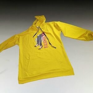 Bright yellow hoodie with a bold graphic design. Features a front pocket and drawstring hood.