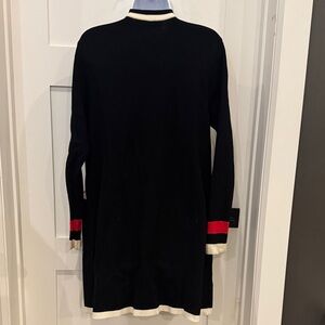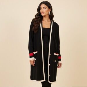 Elegant black cardigan. Features red and white accents. Button-down front. Perfect for layering.