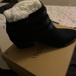 Chic black ankle booties with stylish strap detail. Comfortable and versatile for any outfit.