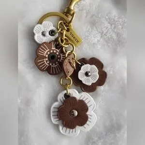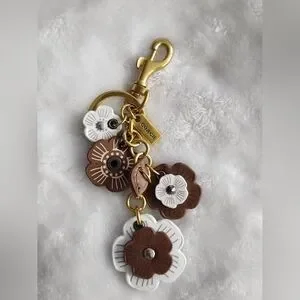 Chic floral design with brown and white flowers. Gold hardware adds elegance. Perfect for keys or bags.