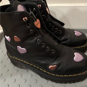 Chic black boots with colorful heart details. Durable and stylish. Perfect for a bold look. Worn once and had a little wear.