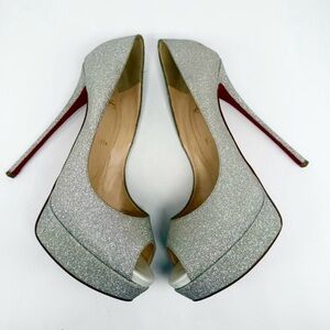 The iconic Christian Louboutin Lady peep. Struts on 150mm stiletto heel and 1 inch platform, leather wrapped in blinding glitter from end to end and signature red soles. Also has brand new red sole protectors from Casali Italy $125 worth. Very grippy and comfortable. Worn literally a couple times Can’t you tell? Not a smudge, not a scratch, not anything. Lost the original box. Comes in a generic box along with original dust bags. Don’t let this once in a lifetime opportunity pass you. Selling for 40% off retail. Original retail $945. Liquidating for $575
