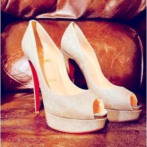 Christian Louboutin Lady Peep 150mm 1" Plat, Champaign Glitter wrapped Lthr EU40