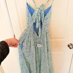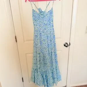 Chic blue maxi dress with floral pattern. Features adjustable straps. Ideal for casual outings.