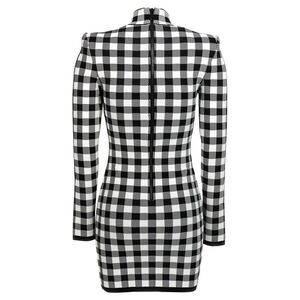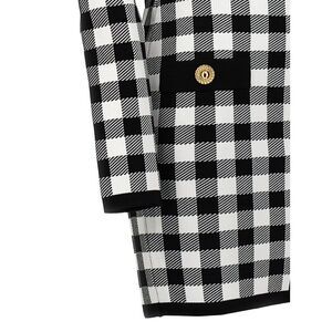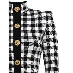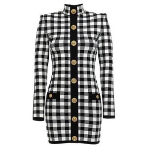 Vichy print viscose blend knit dress, High neck, Long sleeves, Back zip closure, Padded shoulders, Front logo buttons. true to size fit