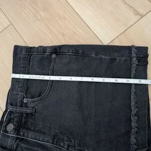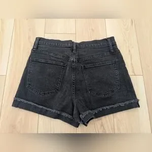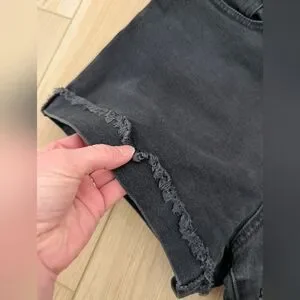 Stylish black denim shorts perfect for casual outings. Features a frayed hem for a trendy look. Comfortable and versatile for everyday wear.