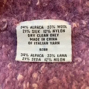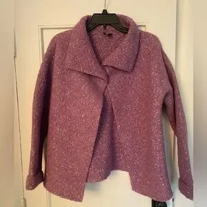 Beautiful chunky knit cardigan/jacket by Eileen Fisher. The color is a lavender/lilac. It is a women’s size XS and is in very good preowned condition. Turndown collar style. Boucle. Made of 34% alpaca, 33% wool, 21% silk and 12% nylon. Size XS