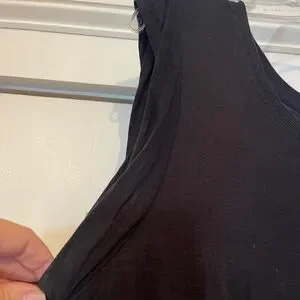 Elegant black midi dress. Sleeveless design. Intricate hem detailing.