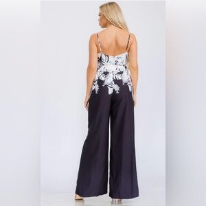 This chic statement piece features a bold abstract print bodice with delicate straps and a flattering fitted waist that flows into elegant wide-leg pants. The contrast between the patterned top and solid black bottoms creates a polished, sophisticated silhouette.