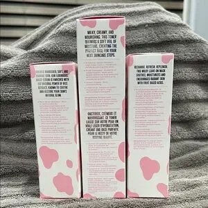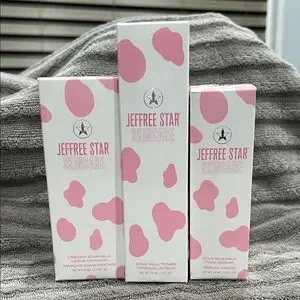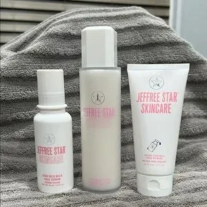 Brand New Jeffree Star Skincare Toner, Serum, and Leave on Mask. Elegant pink and white design. Perfect for daily skincare routine.