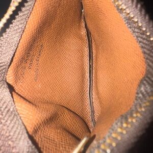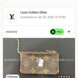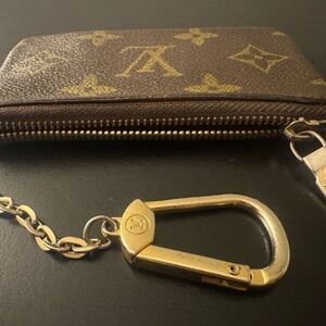 Stylish key holder with iconic monogram design. Features secure zip closure and gold-tone chain.