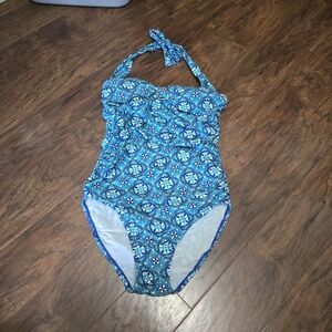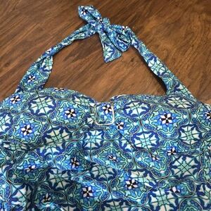 Stylish blue halter swimsuit with a unique pattern. Perfect for beach days. medallion geo turquoise color. very pretty. no wire. ties around the neck. . size medium. comes from a smoke free home.