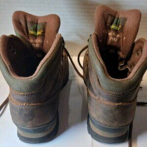 Timberland women’s leather hiking boots in brown with padded collars, metal eyelets, and rugged outsoles. Pre‑owned and in good condition with normal wear from use — light creasing and scuffing on the leather, but no major flaws. Soles have solid tread left and the interiors are clean. Classic, durable Timberland build made for trail or everyday wear.
