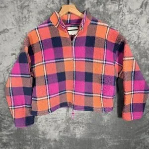 Stay comfortable and stylish with this vibrant American Eagle fleece pullover. This piece features a bold multicolor plaid pattern in shades of pink, orange, and purple, perfect for adding a pop of color to your wardrobe. The soft sherpa fleece material and modern cropped silhouette make it an ideal choice for cool weather and casual outings.