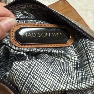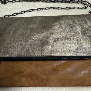Stylish clutch with a bronze metallic top. Tan leather base. Includes a chain strap for versatility.