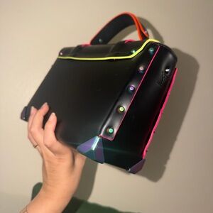 Michael Kors manhattan satchel black handbag with colorful neon trim. Features a top handle and buckle detail. Come with long strap and dust bag.