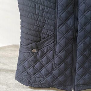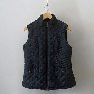 Chic quilted navy blue puffer vest by Ellen Tracy. Ideal for layering. Offers warmth and style. Features two side pockets, lined interior for extra warmth, and a full zip closure.