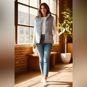 Style tags: puffer vest light blue corduroy preppy layering warm cozy classic
