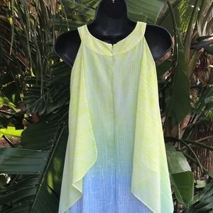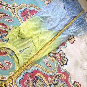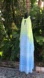 That’s pretty gowns starts out with a limey green and travel to a deeper green to a pastel blue and dark blue ending. The pastel colors are interspersed with a vertical what looks like a raindrop abstract design. The over is a sheer polyester chiffon but the dress is fully aligned and in excellent condition. It looks like a halter from the front and has a cut out but at the back it’s four so you can wear a bra
