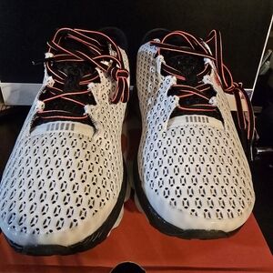 Elevate your performance with these Under Armour shoes. White and black design with striking red accents. Perfect for athletic activities.