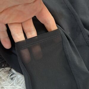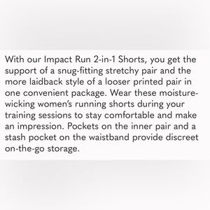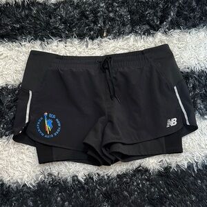 Comfortable black athletic shorts by New Balance. Features a drawstring waist and logo detailing. Inner shorts have thigh pockets for carrying important items like gels. No stains or holes. Loved these for running but no longer fit me.