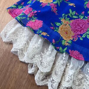 Flowy Umgee tank in vibrant cobalt blue with pink and yellow floral print. Features delicate spaghetti straps and a dramatic cream lace ruffle hem for that romantic, layered look. Lightweight and airy with soft movement — perfect for summer festivals, beach trips, or cottagecore styling with denim shorts.