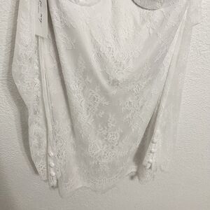 The ultimate fashion-forward bride's rehearsal dinner dress - meet Britt! Britt is an off the shoulder lace mini dress from bridal favorite Katie May.It dazzles with its sheer white lace long sleeves and low scoop back.Lightly padded underwire cups with boned bodice. Fully lined.