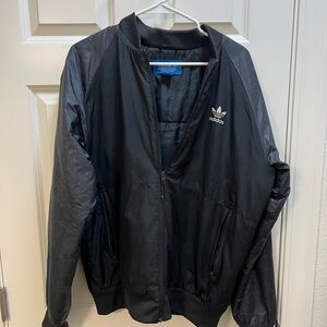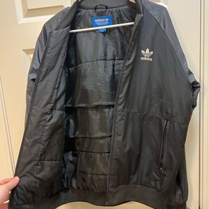 Sleek black bomber jacket by Adidas. Features classic design with logo detail. Ideal for casual wear.